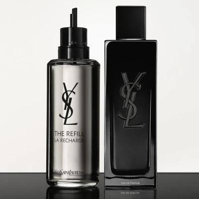 Tous les formats de MYSLF sont rechargeables. La recharge de l’Eau de Parfum permet d’économiser 43% de verre, 75% de métal, 21% de plastique, 16% de papier*.